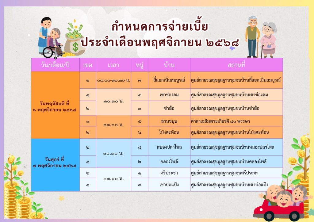 กำหนดการจ่ายเบี้ยประจำเดือน พฤศจิกายน ๒๕๖๘