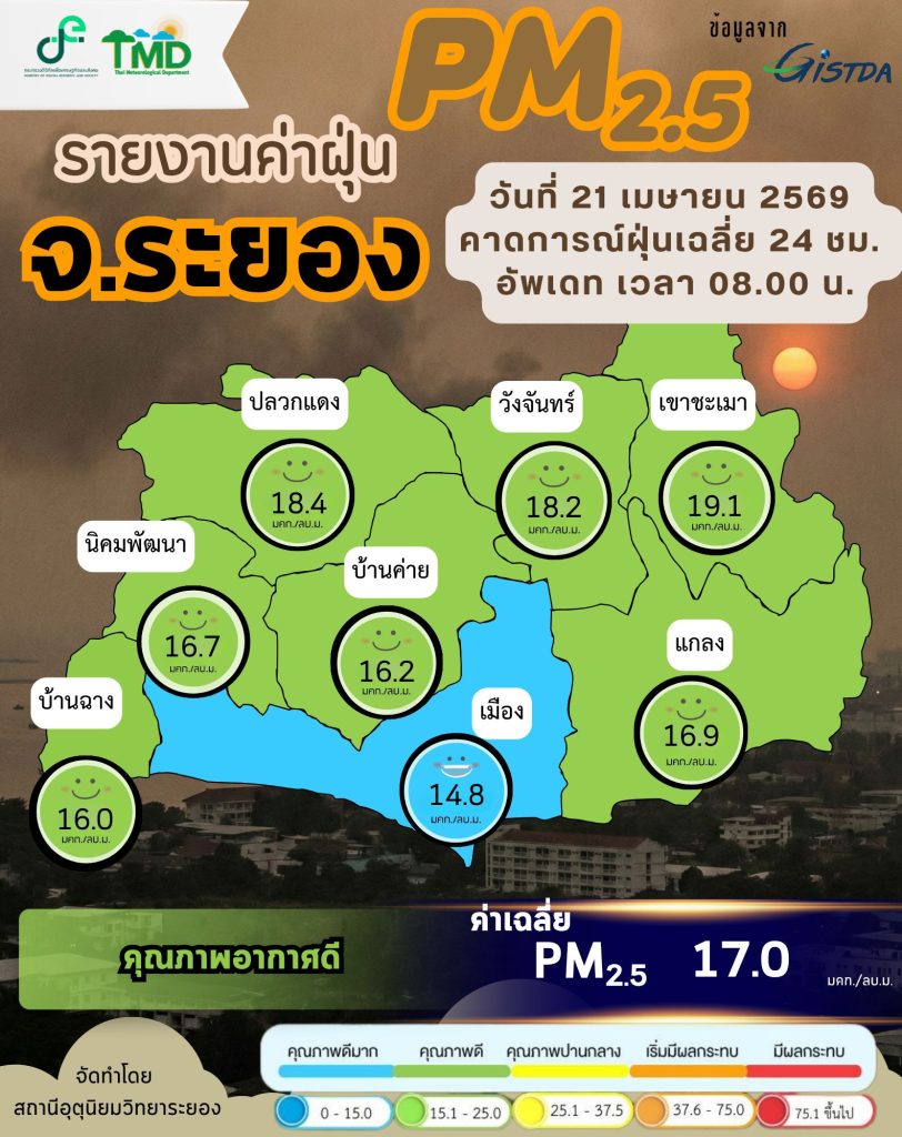 ทั้งนี้ ค่าฝุ่น PM2.5 ในทุกพื้นที่ของจังหวัดระยองยังอยู่ในระดับ “คุณภาพอากาศดี”