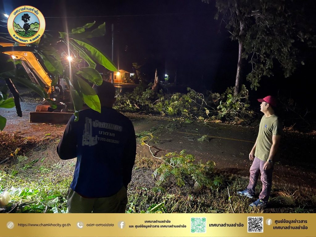 เทศบาลตำบลชำฆ้อ ได้รับแจ้งต้นไม้ล้มกรีดขวางทางจราจร พื้นที่หมู่ ๒ เนื่องจากเกิดพายุฝนลมกระโชกแรงทำให้ต้นไม้ล้ม อาจทำให้ประชาชนที่ใช้เส้นทางจราจรนี้เกิดอุบัติได้ นายเอกพนธ์ ศรีเพ็ชร รองนายกเทศมนตรีตำบลชำฆ้อ พร้อมด้วย ผู้ใหญ่บ้าน ผู้ช่วยผู้ใหญ่บ้าน และงานป้องกันบรรเทาสาธารณภัย สังกัดสำนักปลัดเทศบาลตำบลชำฆ้อ จึงลงพื้นที่เพื่อดำเนินการตัดต้นไม้ และนำออกจากทางจราจร